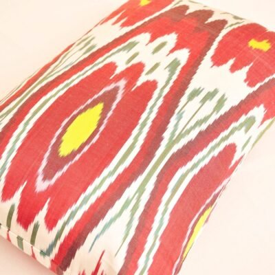 Indeed, this Uzbek ikat pillow is a handicraft texture of genuine IKAT. A distinctive feature of ikat textiles is the use of natural intense colours. While this can be specially attributed to the closeness of particular dye sources and the love of striking effects, it also has a religious connotation, with the sense of combined imagination of heaven held in beauty. On the other hand, colour combination is the fruit of the influence of the aesthetics of foreign cultures. Dyeing, like pure Uzbek ikat weaving and embroidery, is an exclusive craft in the Asian population.
