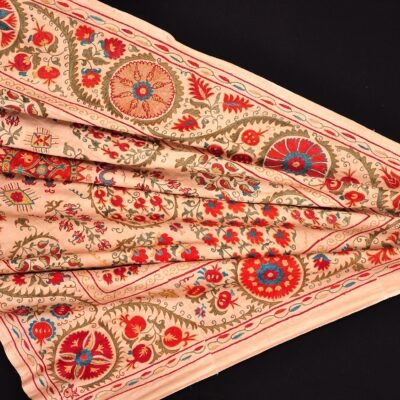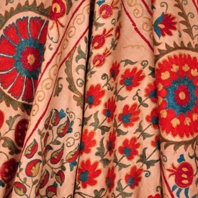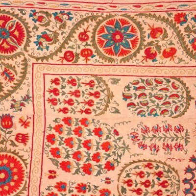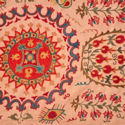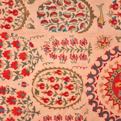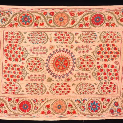 The term Suzani means “needlework”–specifically, the exquisite cotton thread embroidery panels. Traditionally this embroidery work began at the birth of a daughter and continued, with the help of family and friends, until the bride’s dowry was complete. Suzani embroideries relating to the first, early period were white, red and yellow cloths. Handicraft specialists dyed it before starting embroidering fabric. Then, it was called “shushta” literally washed is from “shushtan” and to wash is from folk’s “shushtan”. Regardless of its place of origin, the first thing that always strikes you about a suzani is the distinctive central roundel, known as the palak or a gul. A palak is a heavenly orb, often stylized to look like giant red flowers. Of other branches of embroidery art in several Central Asian regions with the Tajik and Uzbek population, there were large decorative embroideries, panels making. Given that the term of suzani ( needlework, as “Suzan” is the Tadjik for the needle in Samarkand was popular to designate just one kind of embroideries.