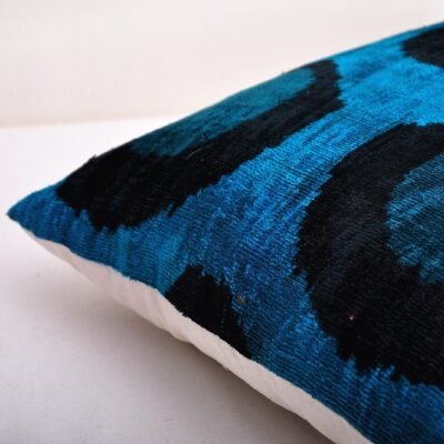 Designer velvet fabric used for the blue black decorative ikat pillow is the most antediluvian traditional woven. Velvet is a choice not only for clothing but also for furnishings. Velvet upholstery, velvet decorative throw pillows are the greatest authentic decor for you cozy home. Silk velvet ikat fabric is also famous with the name baghmal in Tadjik and Uzbek and as maghmal in Persian. First a manufacturer in the case of the silk velvet ikat fabric dyes warps many times the length of the finished fabric formed the raised velvet pile. Then he arranges the ikat dyed warp threads on the loom between plain orange or pink dyed foundation warps. Woves the cloth in plain velvet technique. Upon completion, the raised pile is not clipped. A razor is through the wire groove leaving a perfectly even, clearly ikatted, pattern on the pile.