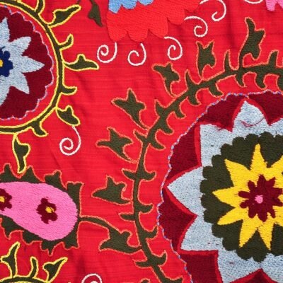 This Suzani reflects one of the ancient ways of cloth decoration of Islamic world. The term Suzani means “needlework”–specifically, the exquisite cotton thread embroidery panels made by Uzbek women. Traditionally this embroidery work began at the birth of a daughter and continued, with the help of family and friends, until the bride’s dowry was complete. As the Soviet era ended and Westerners discovered Central Asian folk arts, the price of antique suzanis skyrocketed. Now maharani arts brings you recent and contemporary suzanis, affordably priced. Bukhara Red Suzani embroidery is genuine folk art, stitched by hand in the traditional manner. Once used as coverlets for the bridal bed, these gorgeous textiles can bring color and texture to any environ. Suzani make delightful wall hangings, bedspreads, furniture throws, pillows, or even tablecloths.