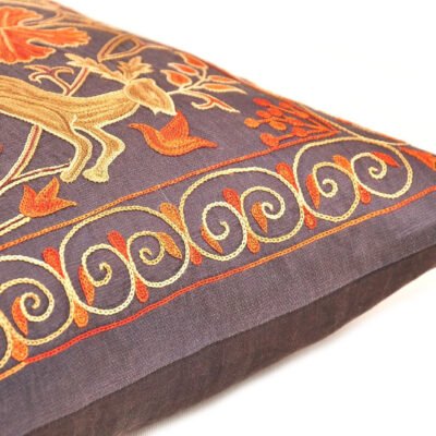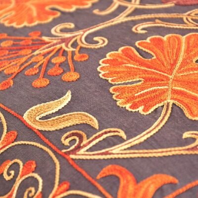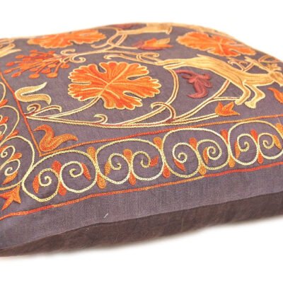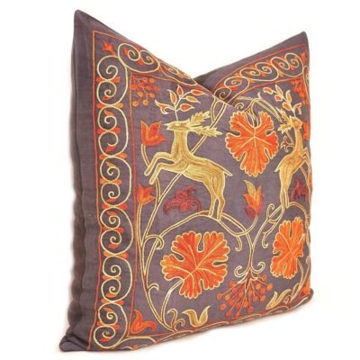 This beautiful hand embroidered suzani cushion handmade with love in Bukhara. Ornament forms and pattern compositions of Bukhara embroideries are so specific that, despite their entire diversity and beauty, one finds no difficulty in distinguishing this local style from all the rest ones, except for those few specimens, which resemble Nurata embroidery and, probably were manufactured under the latter’s influence. Like the ornament of embroideries of other regions of Uzbekistan ( and in all, Central Asian ornament ), Bukhara embroidery patterns depict largely floral forms-leaves, profile flowers and rosettes. However, some of these vegetative forms are viewed as the depiction of different subjects.