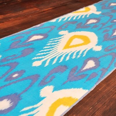 Electro Blue Ikat Textile adds a wonderful piece of the Oriental world to home design. Especially, women adore it because of its exclusive patterns and utilize this fabric as a part of their apparel. Nowadays, the unique patterns of Ikat textiles give piquancy to home décor and create a cosy atmosphere. Moreover, silk and cotton are much more comfortable for the body than other materials. Adras (Ikat) fabric is able to maintain an optimal microclimate for the human body. Ikat can be used in clothing design, interior decor, as well as for the manufacture of additional accessories – scarves, shoes, bags, and hats. Machines wash with shampoo at 30 – 40 degrees. The fabric does not fade, does not crumble, and does not lose colour brightness. EcoFabric works directly with Uzbek masters so we suggest you choose and buy a really high-quality assortment of Adras.