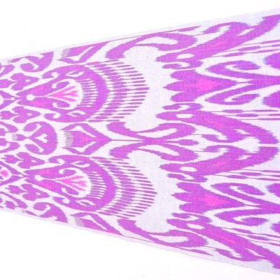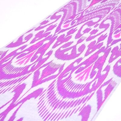 Ikat Fabric is made by a method of tie-dyeing yarn before the fabric is woven. Dyes are traditionally handmade from local plants and minerals. Some pieces take months, even years, to complete the dyeing process using some natural substances. When the dyed yarns are combined a unique and intricate pattern is created. Uzbek Ikat, is a natural handmade and traditional textile of Uzbekistan. The ornament displays rich vivid multicoloured Uzbek traditional patterns. Various shapes on ikat fabrics are depicted as if blurred clouds are running in the field of the item.