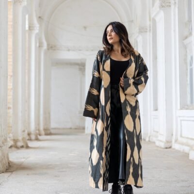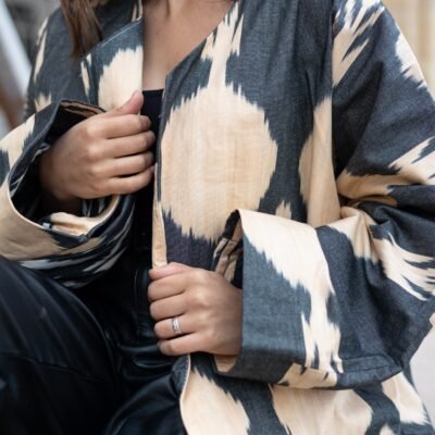 The handmade Uzbek ikat kimono robe is made of fine cotton, which has been decorated with Oriental patterns using ikat dye techniques. Patterns are invented by masters based on their memory to create a unique design. By the way, the reversible feature lets you style it in multiple ways. Last but not least, the kimono robe is soft to the touch, light in weight, and easy to care for. Also, it is comfortable to move around. It is able to maintain an optimal microclimate for the human body.
