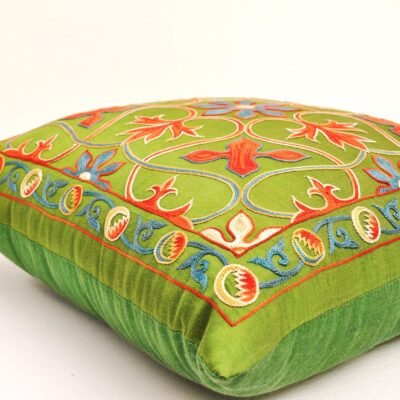 Add Handpicked Green Suzani Pillow to create the sumptuously soft look and feel to your sofa with different textures and patterns. Accessorize your home decor with common colors but unique patterns, like this geometric hand stitched Handpicked Green Suzani Pillow. Moreover, accented design of floral pattern is most vividly evoking springtime and blossoming. Hense colors are matching wonderfully any style of home design. Thus, it brings a sweet nostalgia of old days. Update the look of a chair or sofa with a piece of ancient nomad art to your interior. In addition, Suzani cushion cover handmade with love would be great application to your couch.