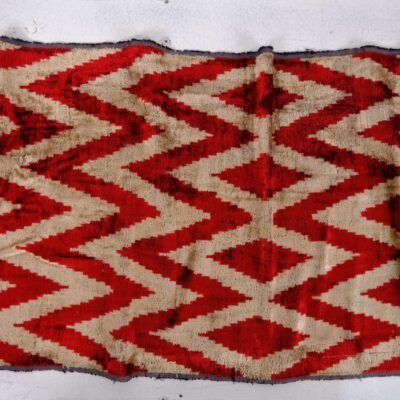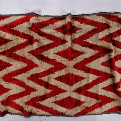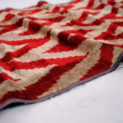 Silk ikat velvet fabric is a unique, handwoven fabric with traditional, oriental design patterns. Ikat Fabric Scarlet Chevron Velvet in national Zigzag style “Velvet” or “Bakhmal” as local people name it. In the Eastern world, Velvet stays in a prominent place and it is in popular demand. Ikat Fabric Scarlet Chevron Velvet have been an integral part of national clothing, culture and interior design. The process of weaving velvet is on a special loom that weaves two thicknesses of the material at the same time. The pattern of Chevron (Zigzag) and the colours scarlet red on milky color is often reminiscent of modern painting. Velvet is little difficult to clean because of its pile, but modern dry cleaning methods make cleaning more executable. The meaning of the word velvety is “smooth like velvet”. Thus, Bakhmal not only looks gorgeous but also is pleasant to touch.