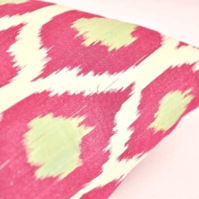Indeed, this pillow is a handicraft texture of genuine IKAT. A distinctive feature of ikat textiles is the use of natural intense colours. While this can be specially attributed to the closeness of particular dye sources and the love of striking effects, it also has a religious connotation, with the sense of combined imagination of heaven held in beauty. On the other hand, colour combination is the fruit of the influence of the aesthetics of foreign cultures. Dyeing, like ikat weaving and embroidery, is an exclusive craft in the Asian population.