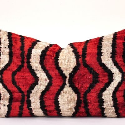 Designer velvet fabric used for this colorful velvet lumbar home accent sofa pillow is the most antediluvian traditional woven. Velvet is a choice not only for clothing but also for furnishings. Velvet upholstery, velvet decorative throw pillows are the greatest authentic decor for your cozy home. Silk velvet ikat fabric is also famous with the name baghmal in Tadjik and Uzbek and as maghmal in Persian. First, a manufacturer in the case of the silk velvet ikat fabric dyes warps many times the length of the finished fabric formed the raised velvet pile. Then he arranges the ikat dyed warp threads on the loom between plain orange or pink dyed foundation warps. Woves the cloth in plain velvet technique. Upon completion, the raised pile is not clipped. A razor is through the wire groove leaving a perfectly even, clearly ikatted, pattern on the pile.