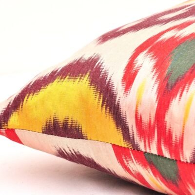 Indeed, this pillow is a handicraft texture of geniune IKAT. A distinctive feature of ikat textiles is the use of natural intense colors. While this can be special attribute to the closeness of particular dye-sources and the love of striking effects, it also has a religious connotation, with the sense of combined imagination of heaven held in beauty. On the other hand, color combination is the fruit of influence by the aesthetics of foreign cultures. Dyeing, like ikat weaving and embroidery is an exclusively craft in the Asian population.