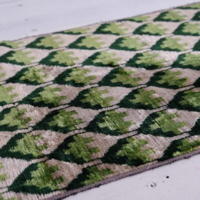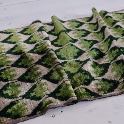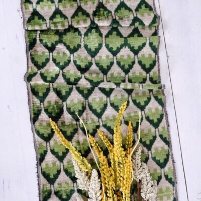 The Green Leaves velvet ikat follows a soft, organic layout where the motif expands along the warp in leaf-shaped curves. The pattern is created through abrbandi, the resist-dye technique in which the warp threads receive colour before weaving. Once the dyed warps are placed on the loom, the familiar feathered boundaries of ikat appear. The velvet surface is produced by cutting a two-layer weave, giving the cloth a quiet sheen and a subtle shift in tone when brushed.