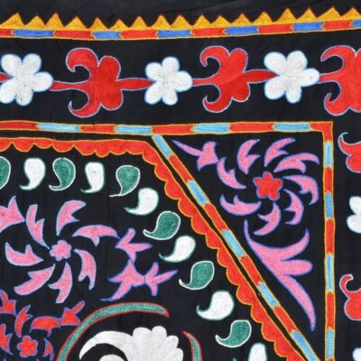 Make a decorative statement with the golden sunburst and colorful borders of this exquisitely hand-embroidered Bukhara Suzani fabric panel. In addition, the different motifs on the textiles indicate where they were produced. The Sunburst Embroidery Suzani is rich in flower and vegetative motives, which transmit absolute beauty of the nature – these are pictures of trees, flowering bushes, various flowers. Ideal as a wall hanging or tablecloth, wall hangings and accessories, the originals of which are scarce. Especially, the black color background gives the thread colors a distinctive glow! The suzani has evolved with time, embracing new ideas, new markets change. We offer the finest and most complete selection of contemporary and traditional suzani embroideries.