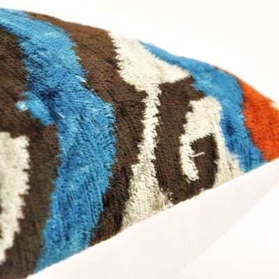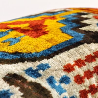 Designer velvet fabric used for this luxury decor bohemian home silk pillow is the most antediluvian traditional woven. Velvet is a choice not only for clothing but also for furnishings. Velvet upholstery, velvet decorative throw pillows are the greatest authentic decor for you cozy home. Silk velvet ikat fabric is also famous with the name baghmal in Tadjik and Uzbek and as maghmal in Persian. First a manufacturer in the case of the silk velvet ikat fabric dyes warps many times the length of the finished fabric formed the raised velvet pile. Then he arranges the ikat dyed warp threads on the loom between plain orange or pink dyed foundation warps. Woves the cloth in plain velvet technique. Upon completion, the raised pile is not clipped. A razor is through the wire groove leaving a perfectly even, clearly ikatted, pattern on the pile.