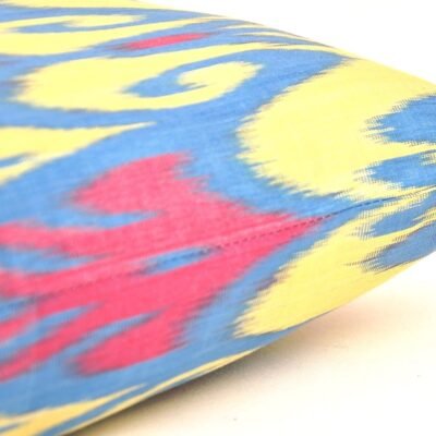 Indeed, this pillow is a handicraft texture of genuine IKAT. A distinctive feature of ikat textiles is the use of natural intense colors. While this can be attributed to the closeness of particular dye sources and the love of striking effects, it also has a religious connotation, with the sense of combined imagination of heaven held in beauty. On the other hand, the colour combination is the fruit of the influence of the aesthetics of foreign cultures. Dyeing, like ikat weaving and embroidery, is an exclusive craft in the Asian population.