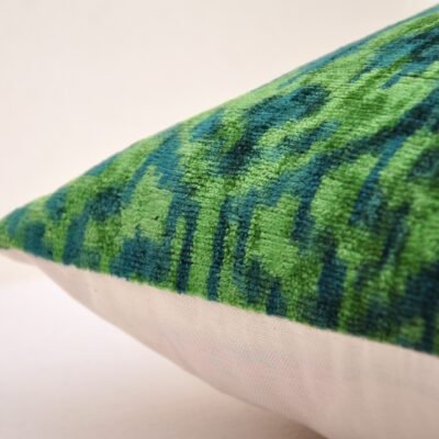 Overdyed Green Sofa Pillowcase used for the cushion is the most antediluvian traditional woven. Velvet is a choice not only for clothing but also for furnishings. Velvet upholstery, velvet decorative throw pillows are the greatest authentic decor for your cozy home. Silk velvet ikat fabric is also famous with the name baghmal in Tadjik and Uzbek and as maghmal in Persian. First, a manufacturer in the case of the silk velvet ikat fabric dyes warps many times the length of the finished fabric formed the raised velvet pile. Then he arranges the ikat dyed warp threads on the loom between plain orange or pink dyed foundation warps. Woves the cloth in plain velvet technique. Upon completion, the raised pile is not clipped. A razor is through the wire groove leaving a perfectly even, clearly ikatted, pattern on the pile.