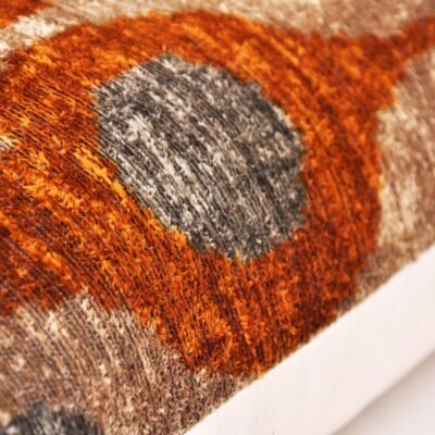 Designer velvet fabric used for this polka dot designer velvet ikat sofa pillow is the most antediluvian traditional woven. Velvet is a choice not only for clothing but also for furnishings. Velvet upholstery, velvet decorative throw pillows are the greatest authentic decor for you cozy home. Silk velvet ikat fabric is also famous with the name baghmal in Tadjik and Uzbek and as maghmal in Persian. First a manufacturer in the case of the silk velvet ikat fabric dyes warps many times the length of the finished fabric formed the raised velvet pile. Then he arranges the ikat dyed warp threads on the loom between plain orange or pink dyed foundation warps. Woves the cloth in plain velvet technique. Upon completion, the raised pile is not clipped. A razor is through the wire groove leaving a perfectly even, clearly ikatted, pattern on the pile.