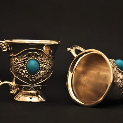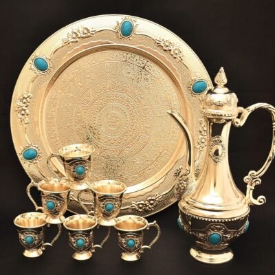Dimensions: brass pitcher – height 27 см, brass plate – diameter 30 см, brass cups – 5 x 4,5 cm