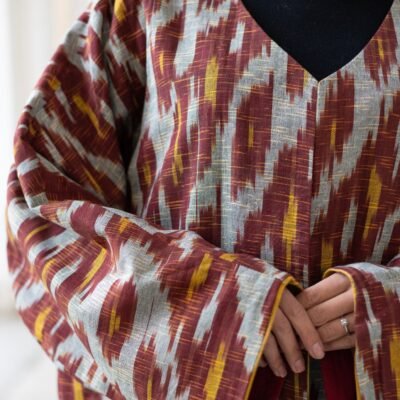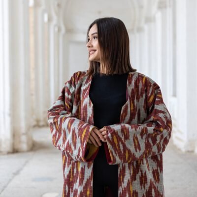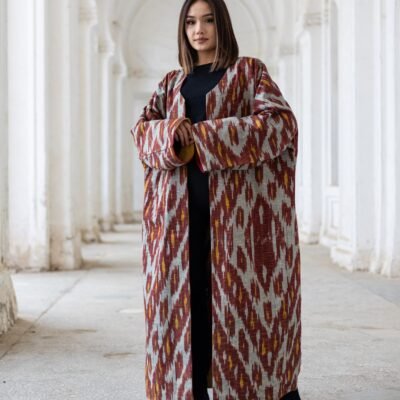 Ikat kaftans symbolize more than just fashion; they represent a cultural heritage and identity. They have been a part of significant cultural exchanges and have contributed to the global tapestry of ethical fashion. Last but not least, the adras coat is soft to the touch, light in weight, and easy to care for. Also, it is comfortable to move around. It can maintain an optimal microclimate for the human body. The technique also originated in East Asia and brought to Central Asia through the Silk Road. Now Ikat Kaftan has received a rebirth in Uzbekistan. Now it is not only a part of traditional national clothing, but also a fashion item.