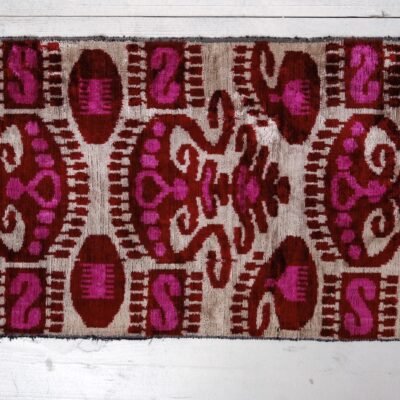 This velvet ikat uses the Tumor (damask-style) layout, where the motif expands symmetrically along the warp. The pattern forms through abrbandi dyeing, with the warp threads coloured before weaving, creating the softened contours typical of Uzbek ikat. The velvet pile is cut from a double-layer weave, giving the fabric its dense, low sheen and directional shift.