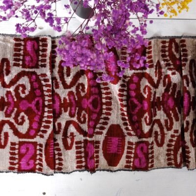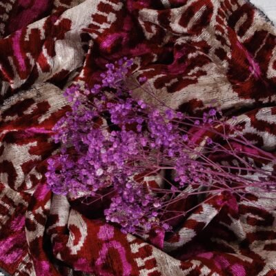 The colours—magenta, dark red, and golden—behave strongly on silk velvet. Magenta absorbs dye deeply and shows its full tone when the pile is brushed upward, while dark red grounds the pattern and adds structure. The golden areas catch light sharply, giving small highlights without metallic thread. This combination is often chosen for autumn and winter garments, or for interior pieces where warmth and colour presence are desired. In home use, it fits well with dark woods, traditional settings, or rooms needing a patterned focal point such as cushions, chair panels, or narrow upholstery.
