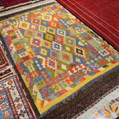 Kilim rug, antique oriental rug – this construction technique produces a flat-weave rug that is thick, strong and exceptionally durable. They are distinguishable by the fact that the pattern is visible only from one side- with the reverse often having threads of yarn 2 to 4 cm long left hanging on the back. The Soumak kilims, antique Turkish rugs are heavy and stiff and make a great floor rug. Designs are almost always bold and colorful and employ many of the design patterns of the knotted Caucasian rugs.