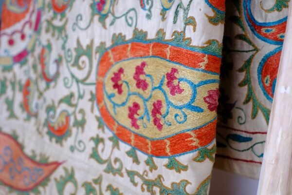 Another interesting aspect of Suzani production is that they are often made in two or more pieces. These individual segments are embroidered separately and then meticulously stitched together to form the final textile. This method not only facilitates the intricate embroidery process but also adds to the distinct charm of Suzani artworks.